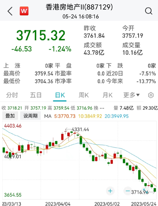 内房股持续受压。5月24日,香港房地产指数跌1.24%。