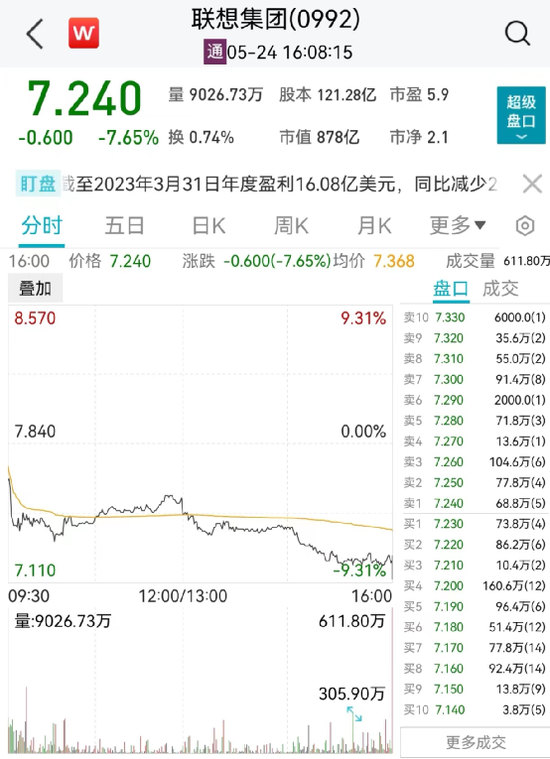 5月24日,联想集团低开低走,最低跌9.31%,收于7.24港元,跌7.65%,近5日累计跌5.36%。