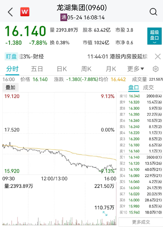 龙湖集团跌一度大跌9.13%,最终收于16.14港元,跌7.88%,领跌蓝筹股。港交所5月24日披露数据显示,截至收盘,龙湖集团沽空金额为1.6亿港元,较上一交易日上升302.64%,较最近30个交易日均值上升151.67%。