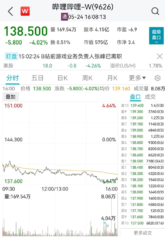 哔哩哔哩5月24日一度跌4.64%,随后跌幅收窄,全日跌4.02%报138.5港元,近5日累计跌2.19%。港交所5月24日披露数据显示,截至收盘,哔哩哔哩-W沽空金额为1.01亿港元,较上一交易日上升153.17%。