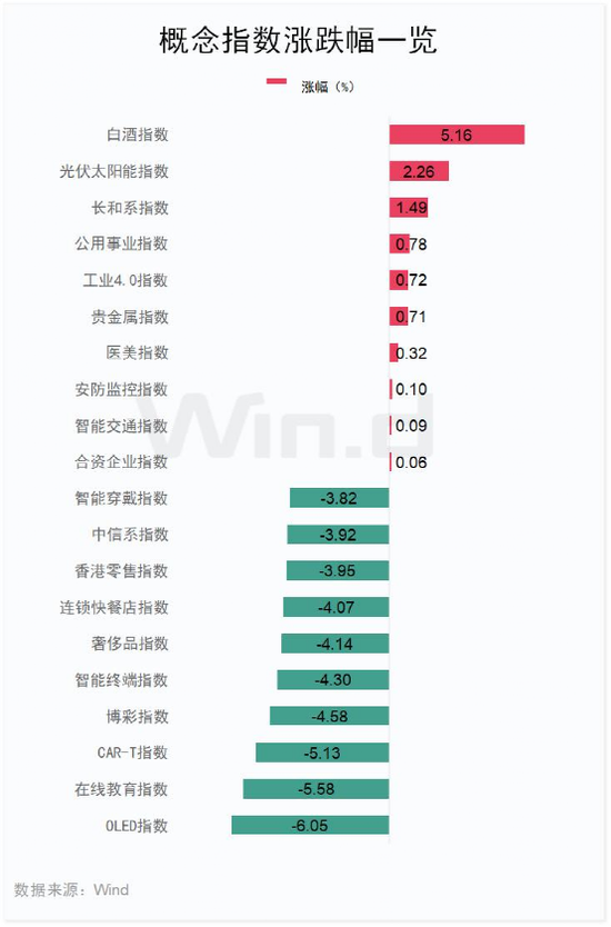 从盘面来看,Wind概念板块多数下跌,OLED指数跌6.05%,在线教育指数跌5.58%,CAR-T指数跌5.13%。涨幅方面,白酒指数涨5.16%,光伏太阳能指数涨2.26%,长和系指数涨1.49%。