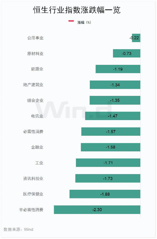 从行业表现看,恒生行业指数日内全线下跌,非必需性消费跌2.3%,医疗保健业跌1.88%,资讯科技业跌1.73%。