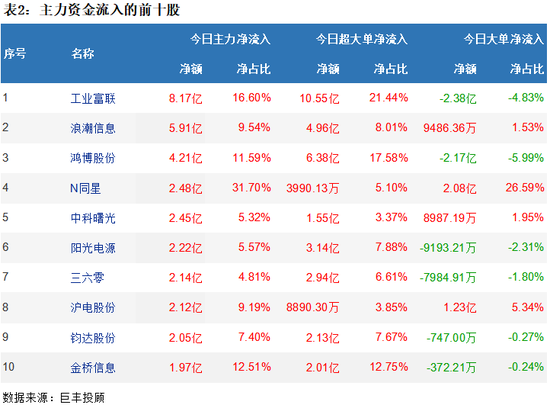 从两市个股主力资金流向来看,工业富联获主力资金净流入8.17亿,浪潮信息获主力资金5.91亿净流入,鸿博股份获主力资金净流入4.21亿,N同星获主力资金净流入2.48亿,中科曙光获主力资金净流入2.45亿。