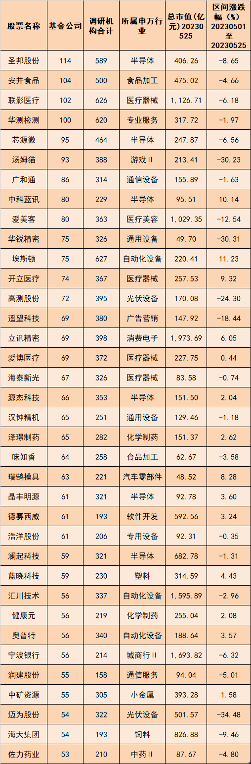 此外,截至5月25日,联影医疗、华测检测、芯源微、汤姆猫在近一个月均被超过90家基金公司调研。广和通、爱美客、中科蓝讯、埃斯顿等多家A股上市公司被超过70家基金公司调研。