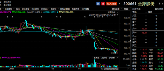 5月25日,圣邦股份收盘价为113.37元/股,当日股价上涨0.31%,总市值406亿元。5月份,圣邦股份股价下跌8.65%。