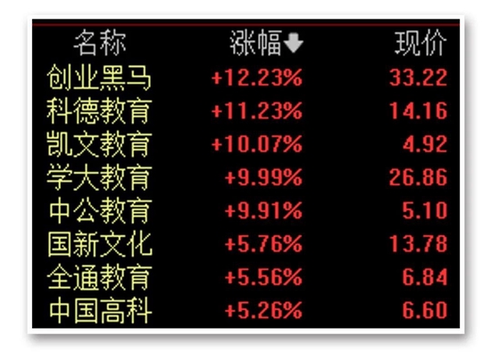 昨天下午AI+主线上演尾盘反攻后,今日继续领涨大盘。教育板块大幅反弹,凯文教育、学大教育、中公教育(维权)涨停。