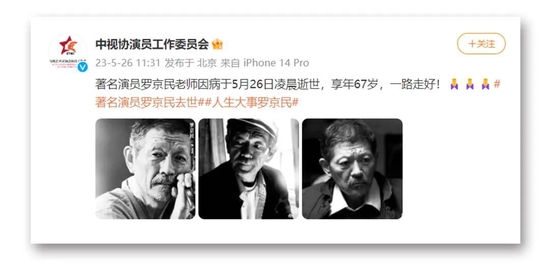 据中视协消息,演员罗京民因病于5月26日凌晨逝世,享年67岁。罗京民曾出演《士兵突击》《我的团长我的团》《人生大事》等影视作品。
