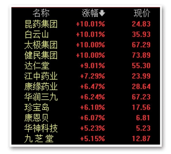 今日午后,中药板块突然大幅拉升,昆药集团、白云山、太极集团等涨停,达仁堂大涨超9%,江中药业、康缘药业等涨幅居前。