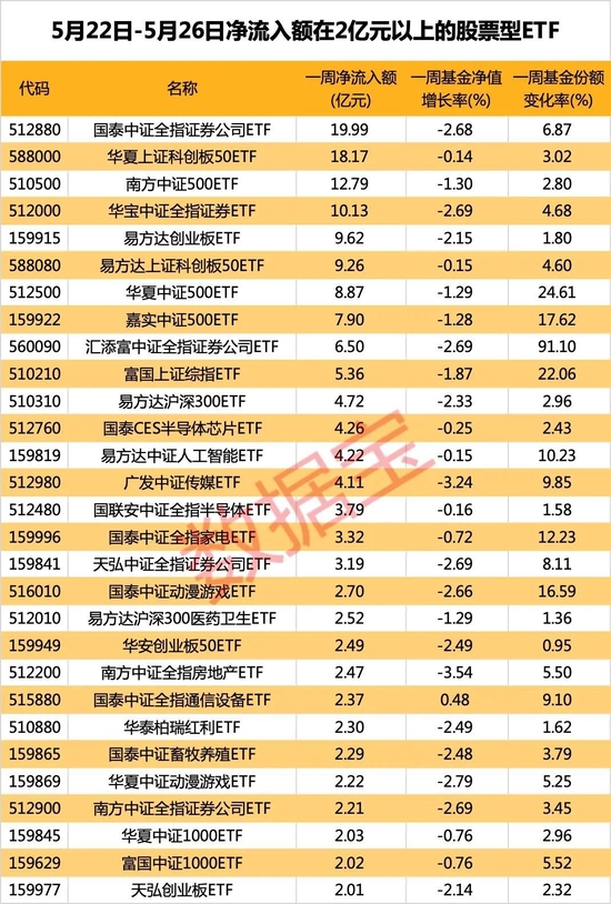 国泰中证全指证券公司ETF、华夏上证科创板50ETF、南方中证500ETF、华宝中证全指证券ETF、易方达创业板ETF位列资金净流入前五强,依次为19.99亿元、18.17亿元、12.79亿元、10.13亿元、9.62亿元。