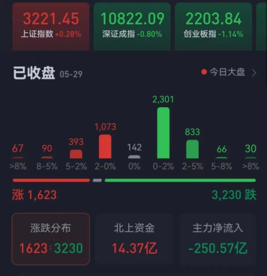 周一(5月29日),A股三大股指震荡分化,涨跌不一。截至收盘,上证指数涨0.28%报3221.45点,深证成指跌0.80%报10822.09点,创业板指跌1.14%报2203.84点;两市合计成交9208亿元,北向资金净买入额达14.37亿元。总体上看,两市个股涨少跌多。其中,涨停个股达41只,跌停个股达43只。
