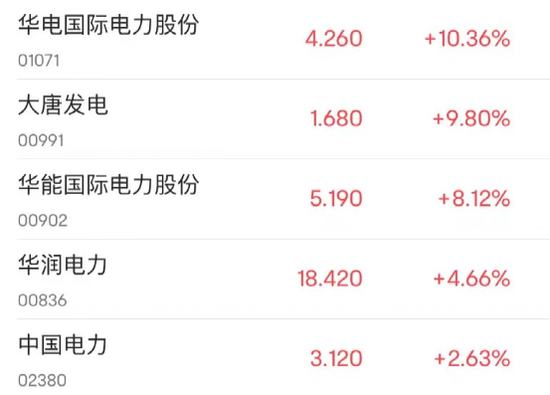 截至收盘,华电国际电力股份涨超10%,大唐发电涨超9%、华能国际电力股份涨超8%,华润电力涨超4%,中国电力跟涨超2%。