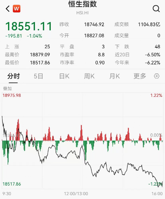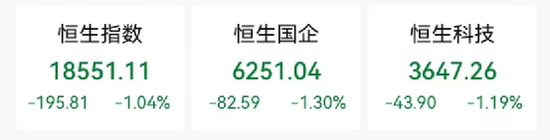 截至收盘,恒生指数跌195.81点,收跌1.04%,报18551.11点;恒生科技指数跌1.19%,报3647.26点;恒生国企指数跌1.3%,报6251.04点。三大指数均刷新约半年低位。