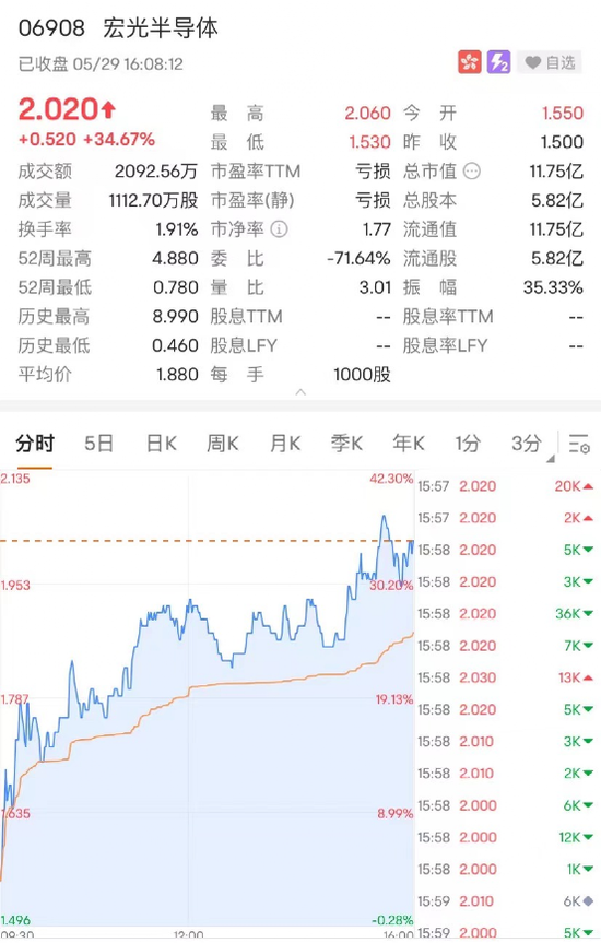 截至收盘,宏光半导体涨34.67%,报2.02港元,股价创近2个月新高;ASMPT涨5.09%,报67.05港元;晶门半导体涨3.3%,报0.47港元;中芯国际涨2.77%,报20港元;华虹半导体涨1.99%,报25.65港元。
