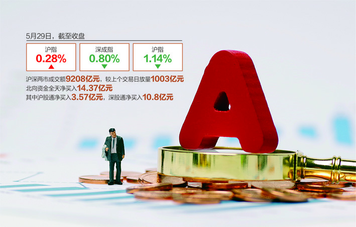 据《每日经济新闻》记者观察,5月29日(本周一),截至收盘,沪指涨0.28%,深成指跌0.8%,创业板指跌1.14%。沪深两市成交额9208亿元,较上个交易日放量1003亿元。北向资金全天净买入14.37亿元,其中沪股通净买入3.57亿元,深股通净买入10.8亿元。
