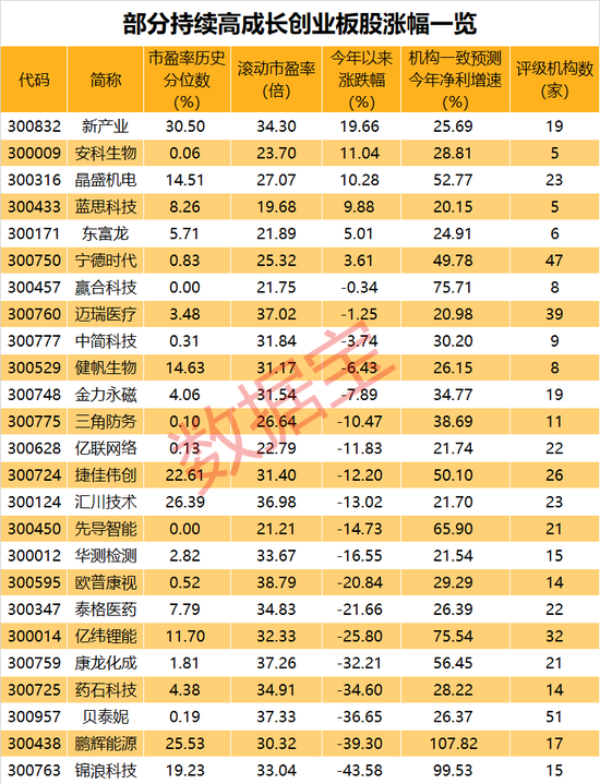 成份股市盈率也大批量处于历史性低位。证券时报·数据宝统计,创业板指中,5只成份股最新市盈率为历史最低,30股处于市盈率历史百分位的10%以下,37股为历史百分位10%至50%之间。