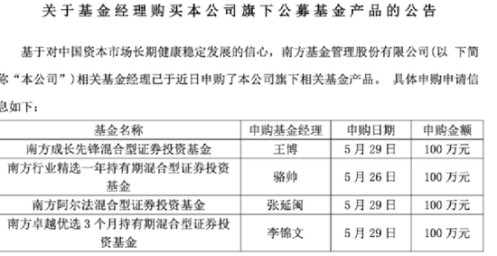 5月30日,南方基金公告称,基于对中国资本市场长期健康稳定发展的信心,南方基金相关基金经理已于近日申购了公司旗下相关基金产品。