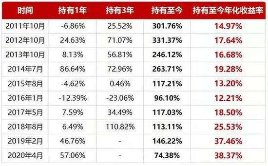 以普通股票型基金指数为测算指标,模拟测算在历史上10个基金发行遇冷期当月首个交易日买入并持有一定时间的收益。