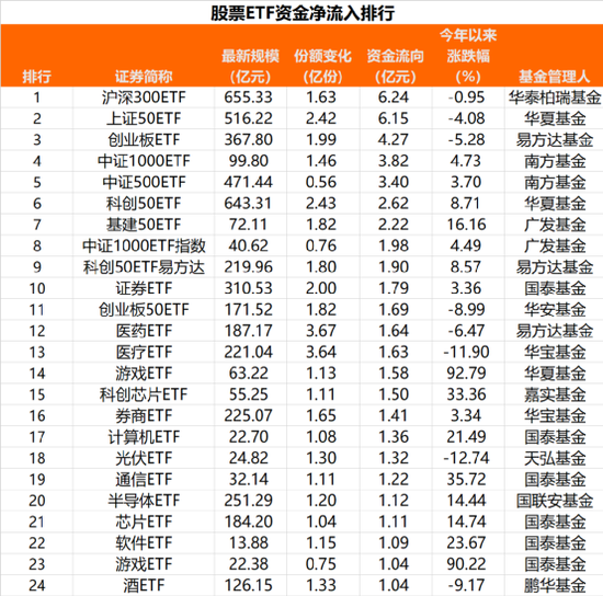 其中,华泰柏瑞沪深300ETF当日份额增加2.62亿份,至170.74亿份。以区间成交均价估算,资金净流入6.24亿元;华夏上证50ETF资金净流入6.15亿元,份额增加4.40亿份,至203.32亿份;易方达创业板ETF当日资金净流入4.27亿元,份额增加1.99亿份,至170.40亿份。南方中证1000ETF、南方中证500ETF、华夏科创50ETF、广发基建50ETF当日资金净流入分别为3.82亿元、3.40亿元、2.62亿元、2.22亿元。此外,易方达科创50ETF、国泰证券ETF、华安创业板50ETF、易方达医药ETF等10多只资金净流入也超过1亿元。