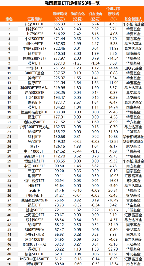 不过,目前规模前四强的宽基指数中,沪深300ETF、中证500ETF等都在今年规模萎缩超百亿,上证50ETF规模也缩水超67亿元,只有科创50ETF规模增长超过135亿。