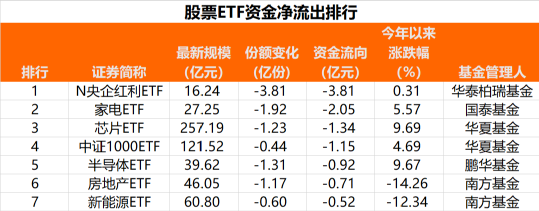 从资金净流出榜单看,刚于5月30日上市的华泰柏瑞央企红利ETF在上市首日便遭遇明显资金净流出,单日份额减少3.81亿份,至16.2亿份,资金净流出为3.81亿元,为单日之最。国泰家电ETF单日资金净流出为2.05亿元,另有华夏芯片ETF、华夏中证1000ETF单日净流出资金也超过1个亿。此外,鹏华半导体ETF、南方房地产ETF、南方新能源ETF当日资金净流出超过了0.5亿元。