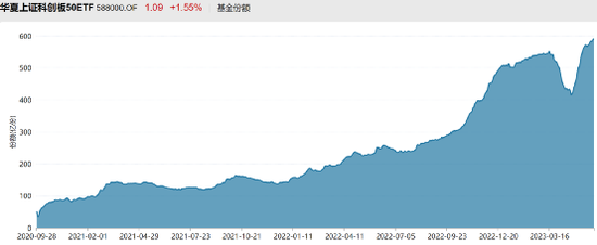 华夏科创50ETF自4月20日以来,份额也在迅速增长,一个多月时间,份额增长超过176亿份,增幅近43%,至591.28亿份,再创历史新高。其中,仅5月份以来份额便增长125.15亿份,规模增加134.88亿元,至643.31亿元,同样创出历史新高。