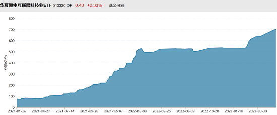 值得一提的是,虽然华夏恒生互联网ETF今年以来净值跌幅接近15%,但越跌越买的态势依然明显,仅5月以来份额增加36亿份,至703.71亿份,再创历史新高。
