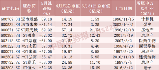 5月份,Wind数据显示,A股共有2648只股票下跌,40只股票跌幅超过30%。剔除5月上市的新股,跌幅居前的十只股票分别为退市运盛(维权)、退市未来(维权)、ST阳光城、ST粤泰(维权)、*ST紫鑫(维权)、*ST宏图(维权)、*ST宋都(维权)、*ST弘高(维权)、ST泰禾、ST恒久。