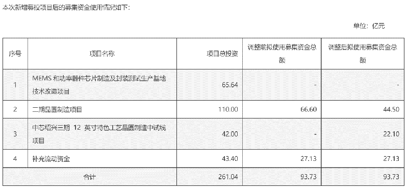 值得一提的是,中芯集成对中芯绍兴三期项目的追加投资来源于IPO募集资金。公司称,原募投项目“二期晶圆制造项目”的资金缺口部分已由公司通过银行项目贷款的形式完成投资,同意调减拟使用募投资金22.1亿元用于新增募投项目中芯绍兴三期项目。