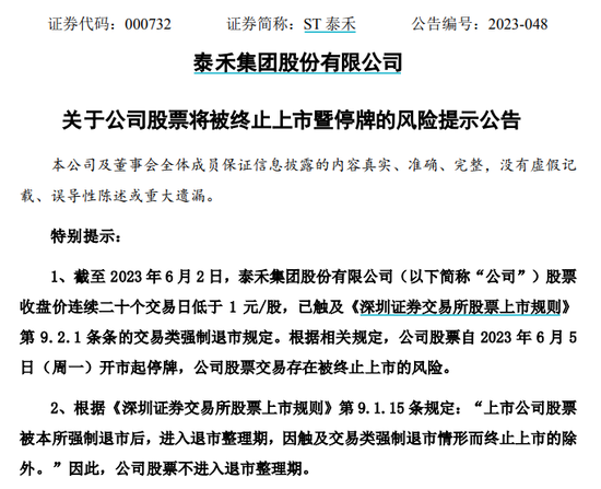 ST泰禾今日开盘一字跌停;盘后,公司发布公告称,截至2023年6月2日,泰禾集团股份有限公司股票收盘价连续二十个交易日低于1元/股,已触及《深圳证券交易所股票上市规则》第9.2.1条的交易类强制退市规定。公司股票自2023年6月5日(下周一)开市起停牌,公司股票交易存在被终止上市的风险。