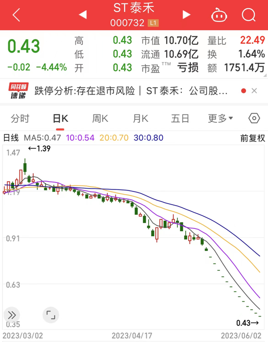 今年以来,该股累计下跌68.38%。截至最新,ST泰禾市值为10.7亿元,按照一季度末的数据来看,持有ST泰禾的股东户数为5.32万户。