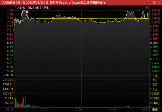 小蔡无言以对,鸿博股份带出来的这一波人工智能他只参与了一只叫立方数科(300344.SZ)的股票,“爱朋医疗(300753.SZ)都能三连板,立方数科也来个三连板不过分吧?”小蔡果断打了立方数科的二板,并认为自己已经悟道,迫不及待向小刀挂出了分时图: