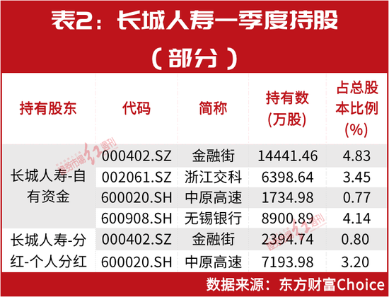 今年一季度,长城人寿共出现在多家公司前十大流通股股东,除了中原高速、浙江交科,长城人寿还现身金融街、无锡银行等(见表2)。其中,对部分公司股数占比较高,如长城人寿自有资金持有无锡银行占比达到了4.14%。