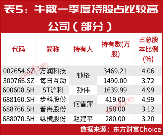 据上市公司披露的一季度股东持仓显示,被知名牛散持股占比在3%~5%之间的公司有多家,如钟格持有的每日互动(维权)、万润科技;孙伟持有的ST沪科;何雪萍持有的步科股份、普冉股份等。另外,还包括赵建平持有的纵横股份等(见表5)。