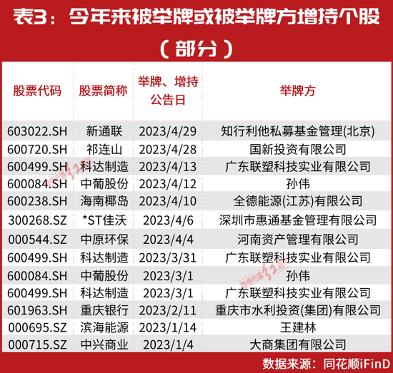 如祁连山4月28日公告,获国新投资有限公司举牌,国新投资持有公司数量由3787.37万股增至 3881.45万股,持股占比由4.88%增至5.00%;4月9日, 海南椰岛公告,此前通过司法拍卖途径获得公司3.35%股份的全德能源于3月27日~4月7日累计增持公司1.65%股份,累计持股比例达到5%。