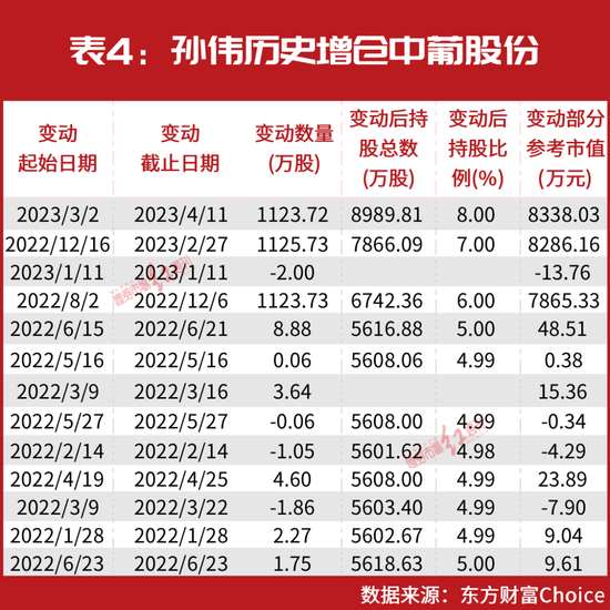 孙伟举牌并持续加码中葡股份“战绩”可圈可点。曾在2022年6月23日,牛散孙伟持有葡萄酒公司中葡股份5616.88万股股份,占公司总股本的4.99%。而在此之后,孙伟并未停止继续买入。如曾在2022年8月2日~2022年12月6日,孙伟即对中葡股份进行了1123.73万股的增仓,至此持股比例变为6%。另外,2022年12月16日~2023年2月27日、2023年3月2日~2023年4月11日期间,孙伟继续对中葡股份给予增仓,两个区间增仓比重均达1%。截至4月11日,孙伟持有中葡股份占比已达到了8%(见表4)。