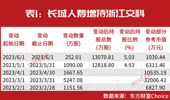 进一步来看,长城人寿本次举牌浙江交科的增仓区间主要集中在今年上半年。如在今年2月~5月,长城人寿累计增持浙江交科超过9000万股(见表1)。