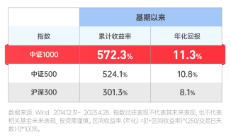 在收益表现上,中证1000指数自基期以来累计收益达572.3%,年化收益11.3%,超过同期其他宽基指数,历史表现亮眼,超额收益显著。