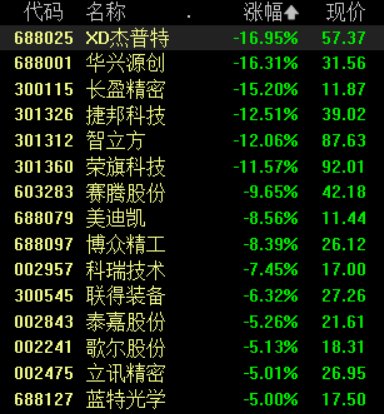 截至发稿,华兴源创、长盈精密、捷邦科技等多股跌超12%,美迪凯、博众精工、科瑞技术等纷纷跟跌。