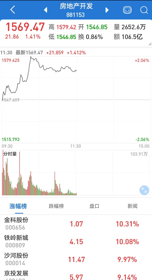 与苹果概念相反的是,房地产板块今日否极泰来,盘中一度直线拉升涨逾2%,半日成交接近昨日全天成交。金科股份、铁岭新城、沙河股份等强势涨停。建筑、物业管理、园林装饰、建材等相关板块纷纷涨幅居前,蕾奥规划20%涨停,中天精装、时空科技等亦强势涨停。