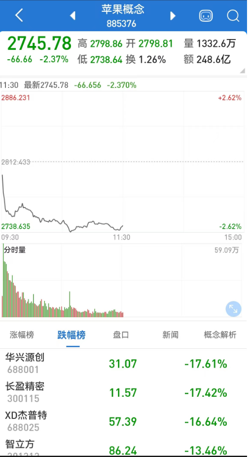 但事与愿违的是,此前热炒的苹果MR概念今日迅速降温全面走低,板块指数放量跳空低开低走,盘中一度重挫超5%。清越科技逼近20%跌停位,半日成交超昨日全天成交,换手率超22%;长盈精密、智立方、兆威机电等纷纷跌停或跌超10%。