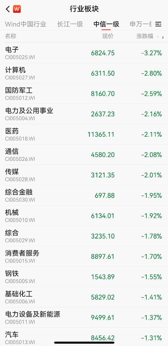 中信一级行业中,除煤炭、建材、房地产上涨外,其余均下跌;其中,国防军工、计算机、电子跌幅靠前,分别下跌2.59%、2.80%、3.27%。576只个股上涨,4516只个股下跌。