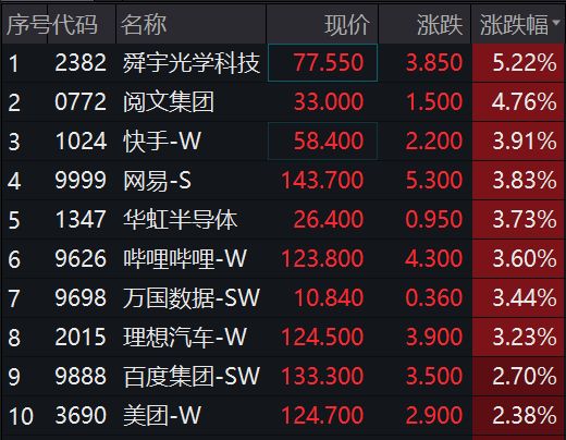 港股市场早间高开:恒指涨1.19%,恒生国企指数涨1.3%,恒生科技指数大涨2.33%。早间网易高开5%,领涨蓝筹。上午港股同样走出浅V,截至发稿三大指数涨幅略有收窄,舜宇光学科技、阅文集团、快手、网易领涨科技板块。