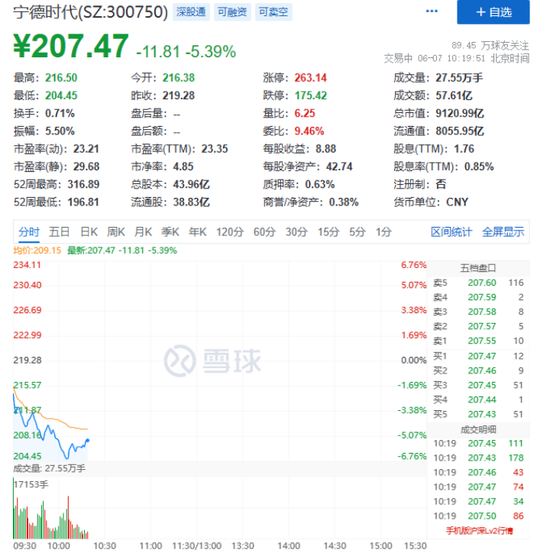 6月7日上午,宁德时代开盘迅速下挫,股价跌近7%,最低价204.45元/股,拖累创业板指行情。截至发稿,宁德时代跌幅收窄至5%,勉强收复9000亿市值。