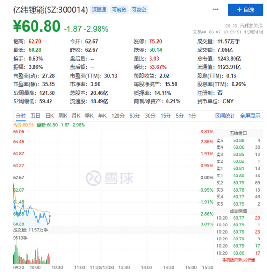除宁德时代外,上午阳光电源、亿纬锂能等权重股均有明显跌幅。