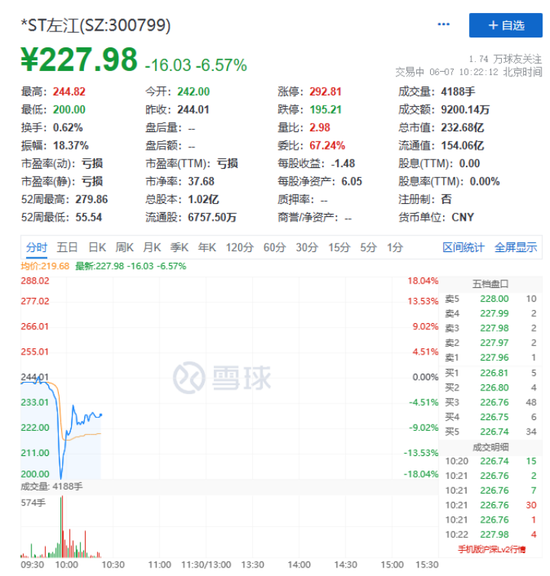 数据显示,年初至今,*ST左江股价累计涨幅超70%。近期股价一度达到279.86元/股的高位,这也是首家股价突破200元的ST股,成为A股史上最贵ST股。