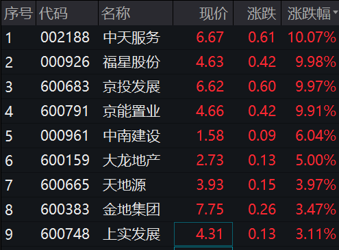 上午盘面热点纷呈,早间房地产板块率先发力。京投发展早间迅速站上涨停板,实现4天3板;中天服务(维权)、福星股份、京能置业接连涨停。