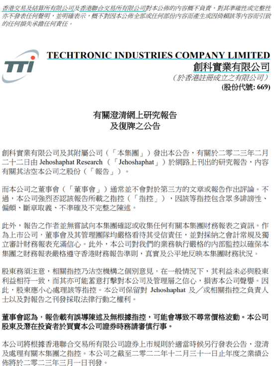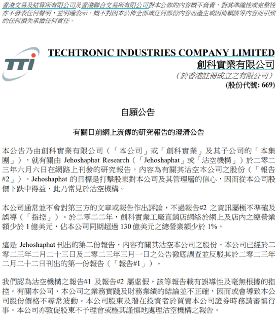 6月6日,创科实业就有关沽空机构Jehoshaphat的研究报告发布澄清公告,公司重申强烈否认所有指控,因其包含多种诽谤性、偏颇、断章取义、不准确和不完整之陈述。同时,保留对Jehoshaphat及/或相关指控之负责人士以及对报告之刊发采取法律行动权利。