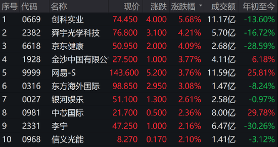 据Wind资讯,科技、博彩、文旅、医药股涨幅居前,创科实业涨近6%领涨蓝筹,舜宇光学科技、京东健康涨超4%。AI概念走强,美图公司涨近9%。内房股分化,龙光集团涨超7%。再现闪崩股,中天湖南集团尾盘直线跳水暴跌76%;海昌海洋公园跌超27%。