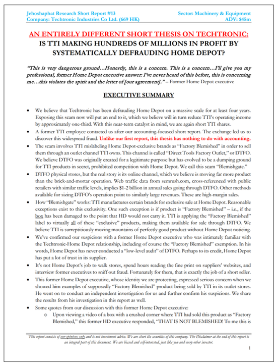 Jehoshaphat在当地时间6月5日发布报告,表示创科实业至少四年以来一直大规模诈骗核心客户家得宝(Home Depot),导致后者错失数十亿美元计的销售额。