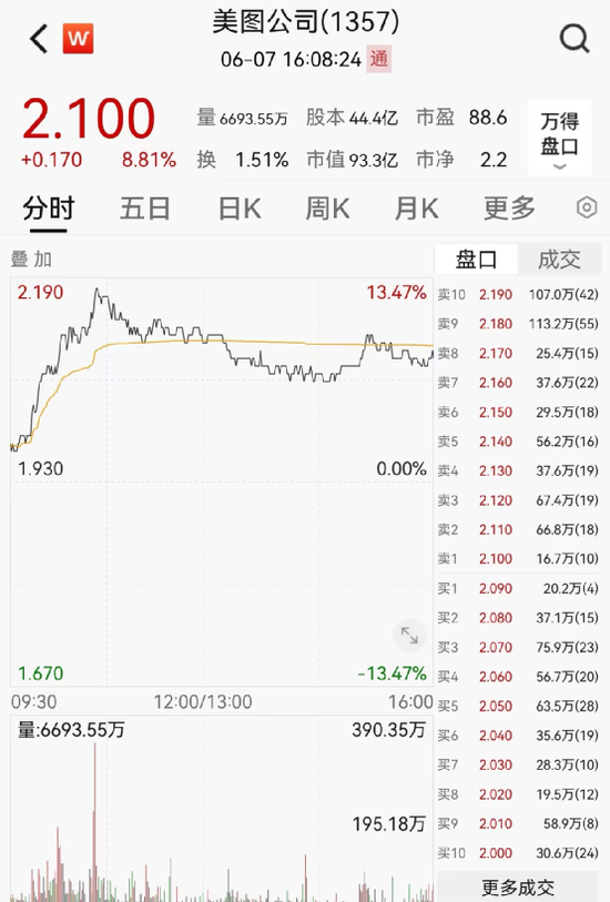 6月7日,AI概念令美图最高涨13.47%,最终收于2.10港元,涨8.81%。
